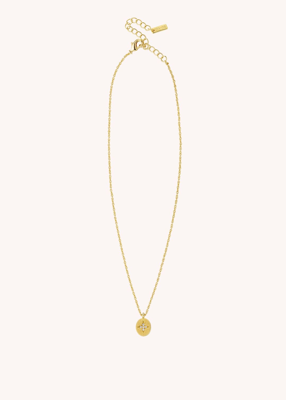 Son mini médaillon en or brossé, orné d’une petite étoile en strass, est suspendu à une chaîne fine. Un bijou lumineux et minimaliste, à porter au quotidien pour une touche d’éclat subtile.